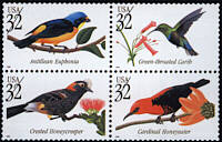 | 3222-25 | 32¢ Tropical Birds (#3225a, block of 4- Antillean Euphonia, Green-throated Carib, Crested Honey-creeper, and Cardinal Honeyeater) | 07/29/98 |