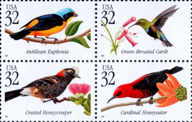 | | 3225a | 32¢ Tropical Birds, block (Antillean Euphonia, Green-throated Carib, Crested Honey-creeper, and Cardinal Honeyeater) (1998) | 2.60 |