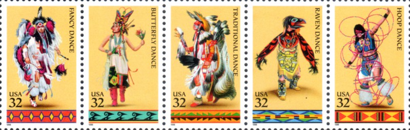 | US | 3076a | 32¢ American Indian Dances, strip of 5 (6/7/96) | 4.50 |