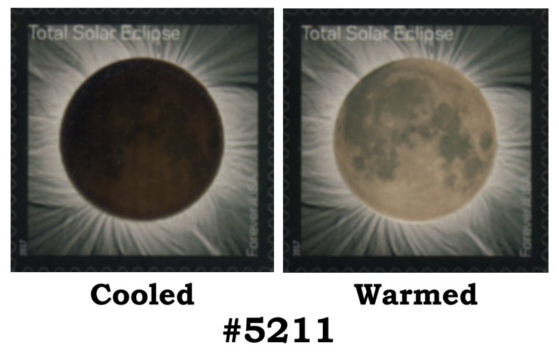 | 5211 | Solar Eclipse (FOREVER/49¢) (06/20/17 printed with 'thermochromic' ink that changes with the heat of your finger, from dark disc covering sun – with the corona still visible – to an image of the moon with the sun's corona behind it.) | 0.90 | |