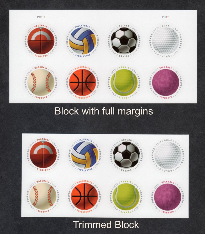 | 5210a | Sports Balls (FOREVER/49¢), horizontal Block of 8 (w/ margins trimmed off, catalog seq.) (06/14/17) | 7.00 | |