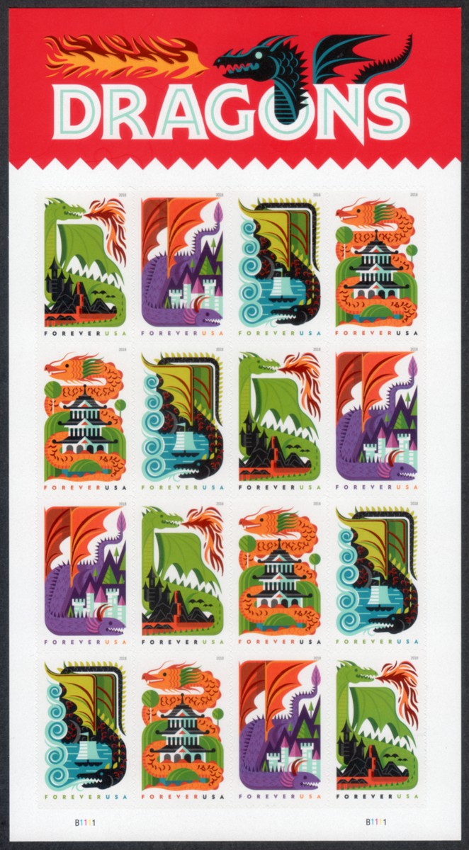 | 5307-10 | Dragons, Strip of 4 or Block (FOREVER/50¢) (08/09/18, STRIP provided unless Block is specified; not in catalog seq.) | 3.30 | |