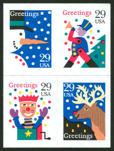 | 2802b | 29¢ Christmas Designs, sa, Block of 4 f/conv. booklet, #2799-2802 (10/28/93) | 2.75 | |