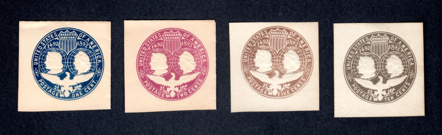 | U348-51 | 5¢ Columbian, Set of 4 CUT SQUAREs, (nice, fresh colors, hinged, U348-9 full corners, U350-1 single paper layer) | 18.00 | |